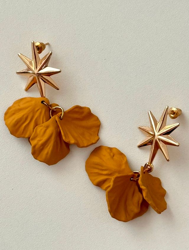 Caravanas colgantes con un diseño delicado que combina estrellas doradas y detalles en tono camel. - Ver más detalles