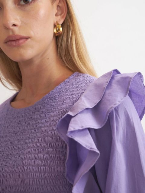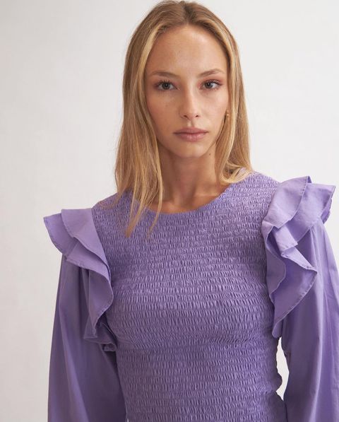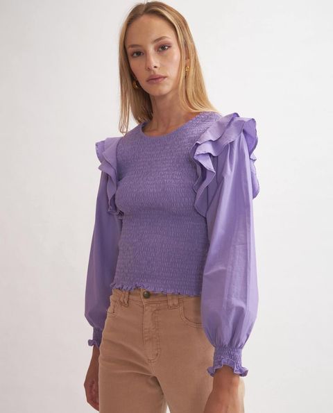 Romántica, moderna y con mucha onda. En tono lila intenso, tiene el cuerpo fruncido que se adapta perfecto y mangas largas abullonadas con volantes que le dan ese toque único. Liviana, cómoda y súper femenina — ideal para looks de día o de noche con un vibe fresco y chic.