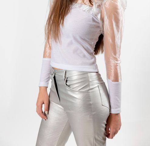 Pantalón metalizado en eco-cuero que se adapta para el día o la noche. Usalo con tacos o zapatillas — siempre funciona.